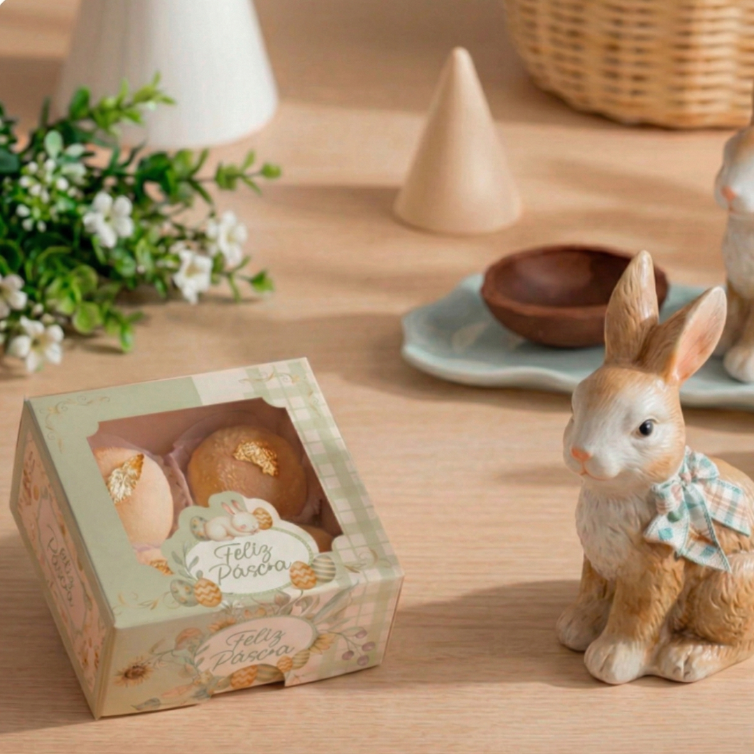 A Caixa 4 Doces Vilarejo foi pensada para trazer charme e aconchego à apresentação de doces de Páscoa. Seu visual acolhedor valoriza cada detalhe e transforma a entrega em um gesto especial, ideal para encantar em presentes e vendas na data mais doce do ano.