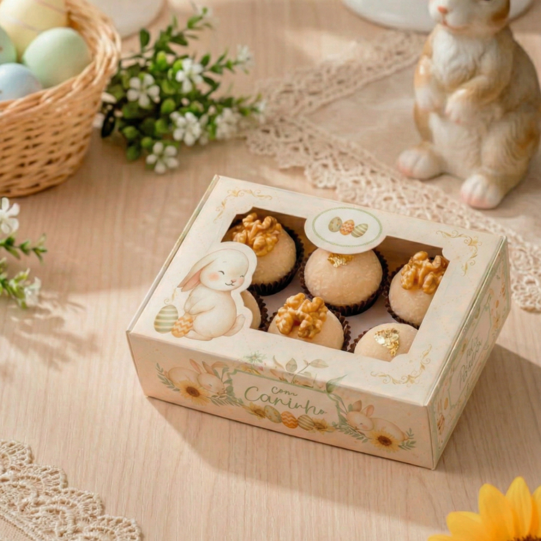 Ideal para confeiteiros e lojistas que querem valorizar suas criações, a Caixa de Páscoa para 6 Doces é prática, bonita e transforma cada doce em um presente inesquecível. Celebre a Páscoa com estilo e carinho.