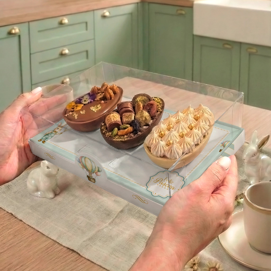 Indicada para acomodar trio de ovos de colher, é perfeita para presentear familiares, amigos e clientes, além de ser uma excelente opção para confeiteiros e chocolaterias que desejam se destacar nas vendas de Páscoa e em datas comemorativas com um presente elegante e afetivo.
