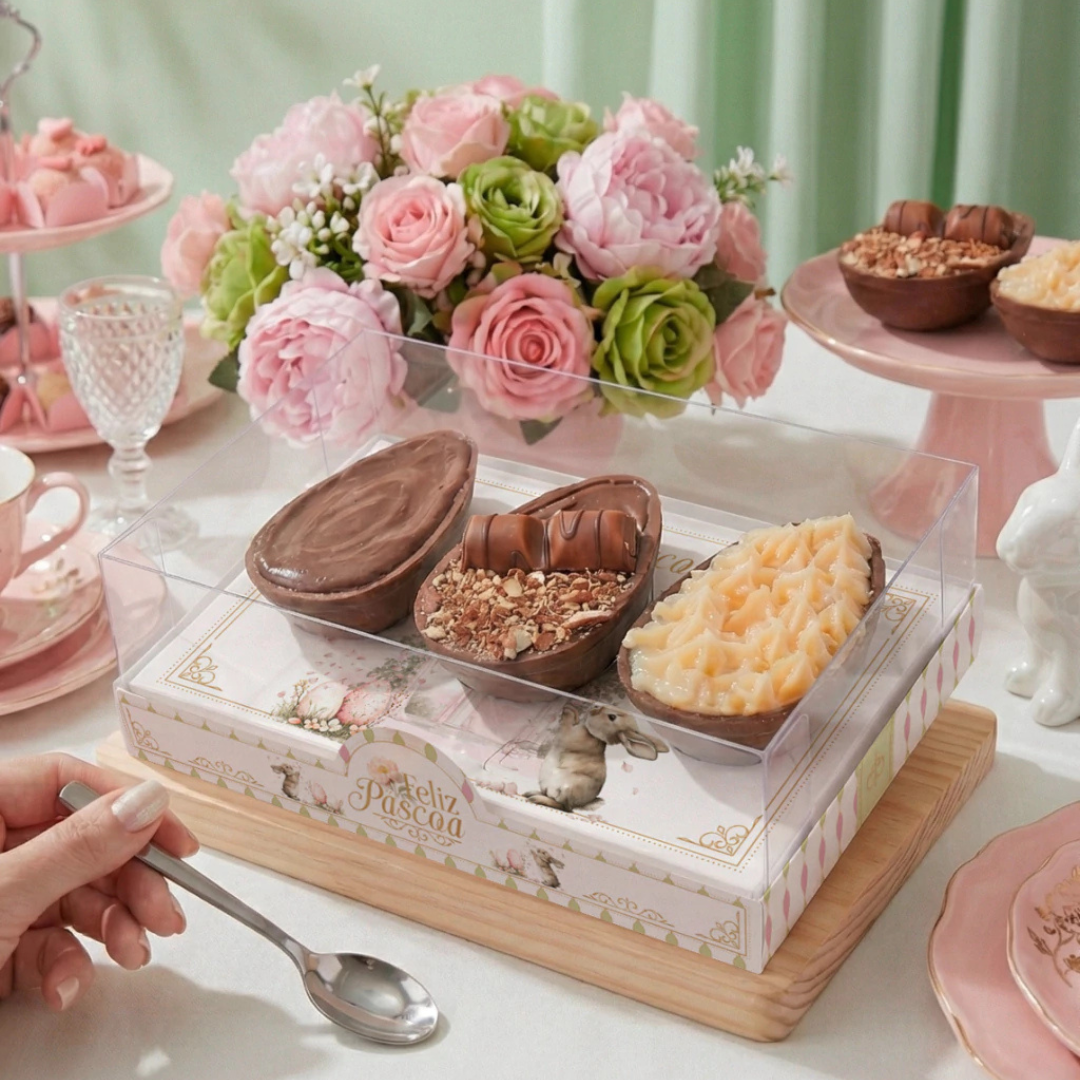 A Caixa Trio de Ovos Carinho foi desenvolvida para valorizar ainda mais a apresentação de ovos de Páscoa artesanais em formato trio. Seu design delicado permite uma visualização completa dos produtos, tornando a entrega mais atrativa e especial, ideal para encantar logo no primeiro olhar.