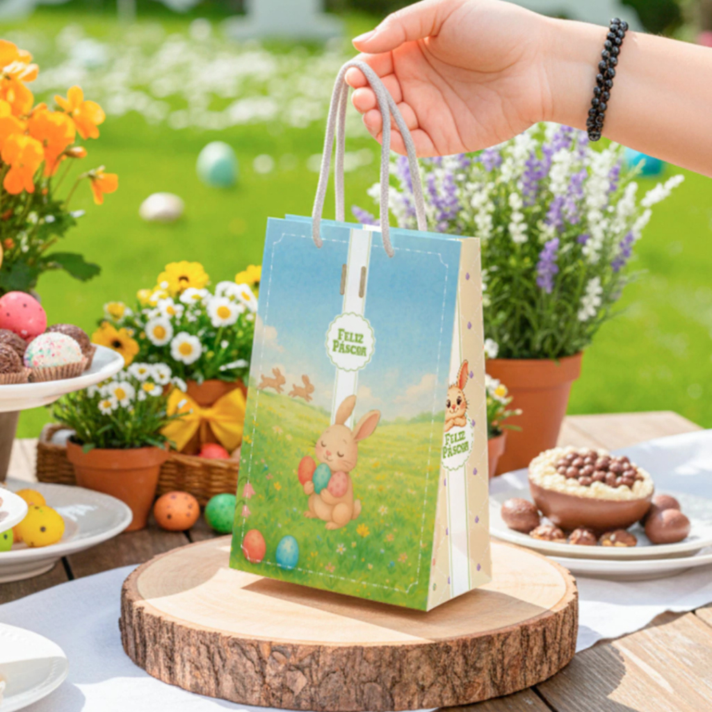 A Sacola Média da linha Caça aos Ovos é a escolha perfeita para quem deseja transmitir a alegria e o colorido vibrante da Páscoa em cada entrega. Com uma ilustração lúdica que remete a um dia ensolarado no campo, repleto de ovos coloridos e coelhos felizes, esta embalagem transforma o transporte do doce em uma extensão da brincadeira. É o complemento ideal para confeitarias que buscam um visual alegre e contagiante, garantindo que o presente se destaque pelo brilho e pela vivacidade das cores, encantando crianças e adultos logo no primeiro contato.